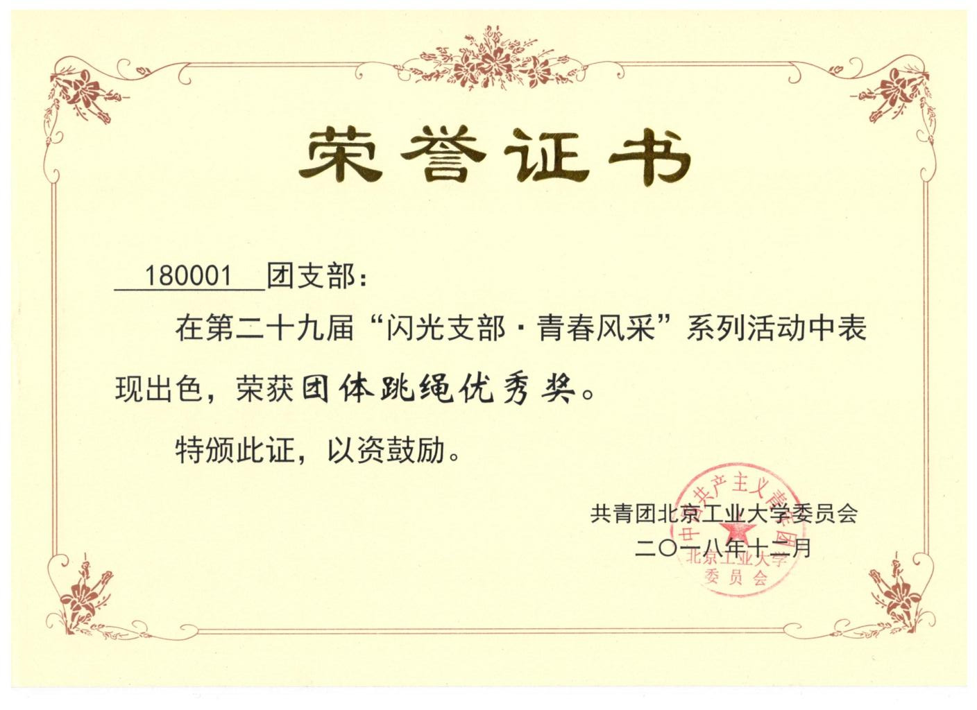 180001团支部 荣获 闪光支部 青春风采 跳绳单项奖