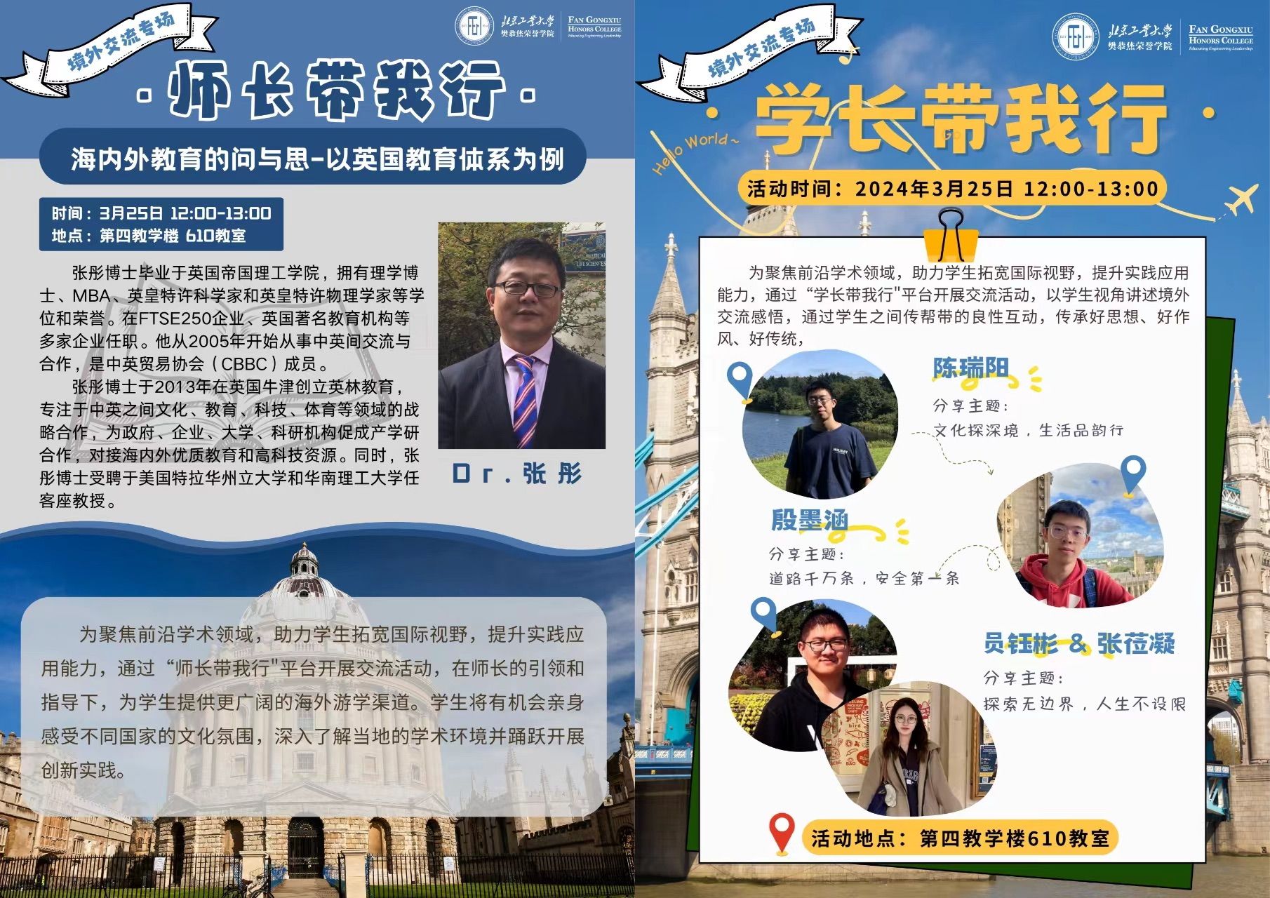 活动伊始,张彤博士通过电影《小谢尔顿》片段切入“海内外教育的问与思”,以英国教育体系为例对国际化培养的内容进行了分享。他鼓励同学们深入了解国际形势,进行框架式学习,培养逻辑性思维。此外,张彤博士以自己在英国多年的求学、工作、生活经历详细介绍了境外游学的各项信息,鼓励大家走出国门,拓宽视野,深入了解国际教育环境、文化差异以及学术发展机会,增强在全球化背景下的竞争力和适应能力。