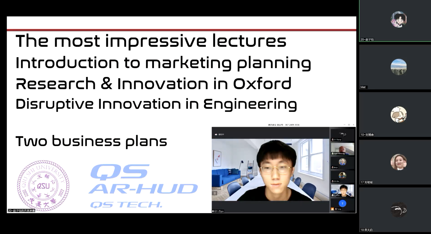 本次暑校活动因为疫情的原因不得不采用线上的方式进行,但是其内容的丰富精彩并没有因为此而削减。我们通过网络,连线到了在牛津大学苏州研究院和在英国工作的教授,听他们讲授关于商业营销、创业、知识产权保护等方面的知识,并且听他们分享自己的科研经验,使我们受益良多。通过几次小组活动,我们将所学到的内容实际运用起来,更加深了我们对这些知识的理解。在Dragon's Den这一环节,我和我们小组的成员一起,运用商业模型,从零开始起草了一份商业计划书,并且模拟面向投资人的情景进行了较为正式的演讲,我认为这是在大学的经历中很难得的一次机会,使我有很大的收获。非常感谢学院和DTC项目的所有老师对我的帮助,让我在暑假期间学到了很多。