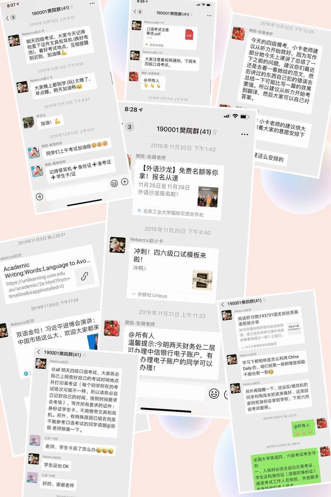 “功夫不负有心人”,同学们在考试之前的两个月里积极备考,在完成课内学习任务的同时,还在课余时间进行针对性的查缺补漏。在190001班学习委员张晔鹏的细心组织和安排下,同学们还举办了各项学习活动,如号召大家参加晚自习,为学习较为吃力的同学找到学伴儿,每天单词学习群里打卡等。
