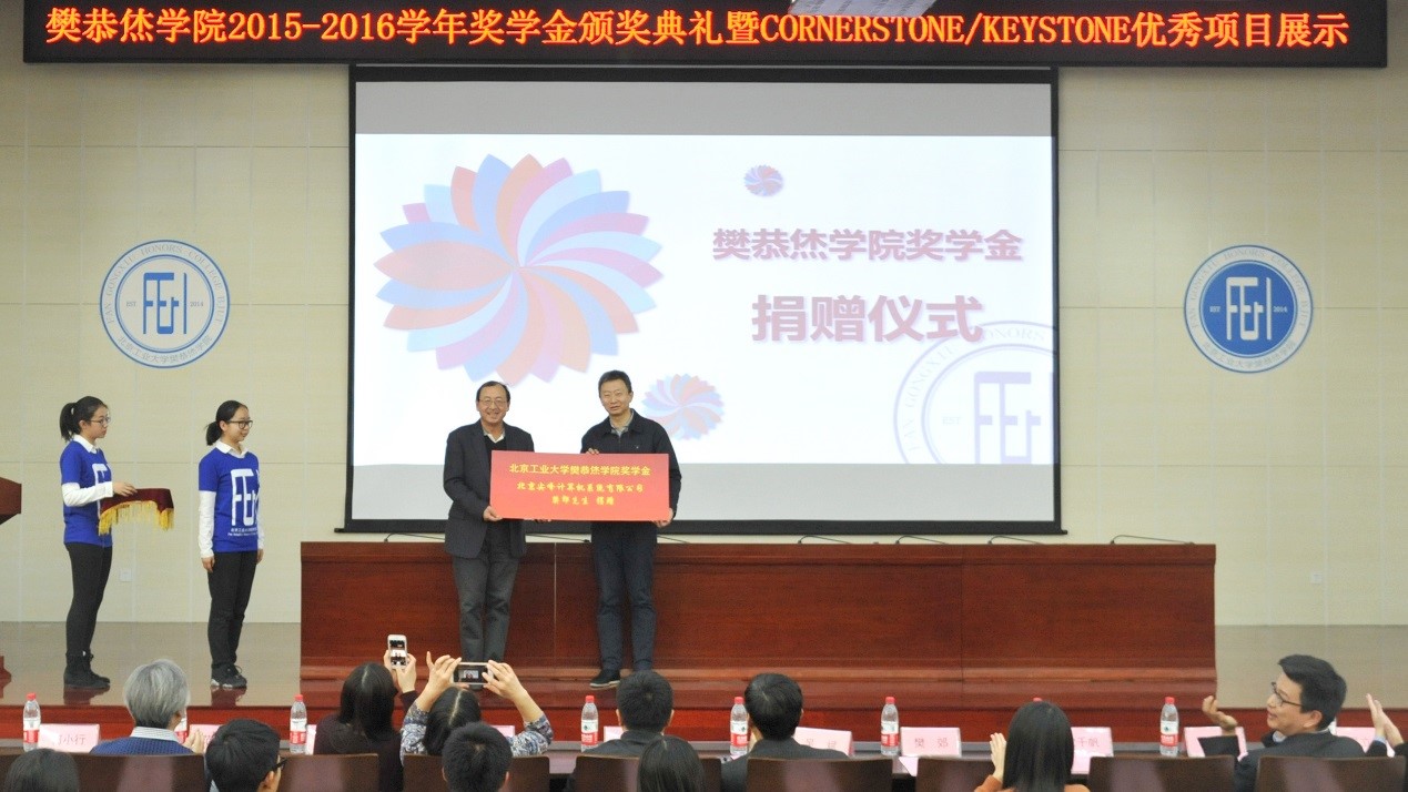 樊恭烋学院2015-2016学年奖学金颁奖典礼暨Cornerstone/Keystone优秀项目展示活动在知新园报告厅顺利举行。北京尖峰计算机系统有限公司创始人及总裁、樊恭烋校长之子樊郊先生出席了本次活动,并代表公司向学校捐赠樊恭烋学院奖学金。校党委副书记沈千帆、副校长吴斌、学校学生处、对外合作联络处、校团委的负责同志、部分任课教师、樊恭烋学院全体师生出席了本次活动。