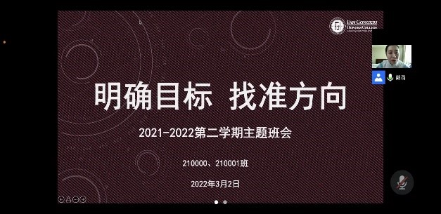 2月19日,学院在线开展了“课‘樊’业渐重,道远志在前”主题班会。本次班会,辅导员戴璐老师面向全体同学开展了防疫防控安全教育,总结了假期的学生工作,并部署了新学期工作内容,对新生年的时间线进行了梳理和分享。开学动员旨在激发同学的学习动力,志在消灭“假期综合征”,全体同学为第一周的线上课程做好充足准备,同时明确了返校的具体时间和注意事项。