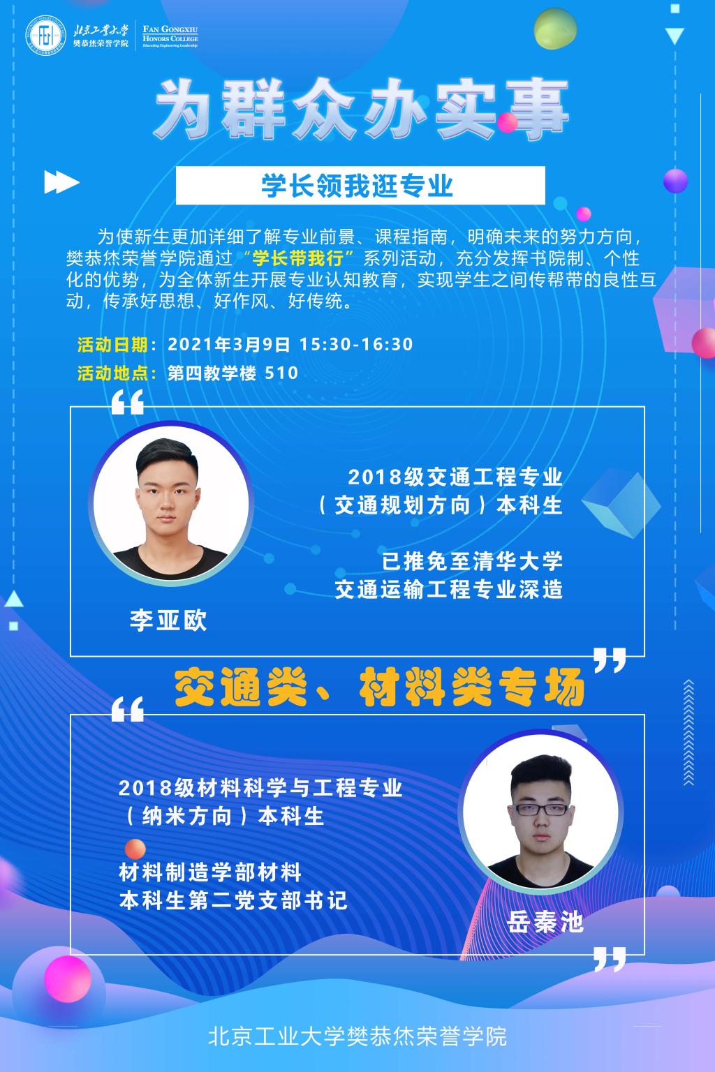 2018级交通工程专业李亚欧学长以及材料与制造学部2018级材料科学和工程专业岳秦池学长,活动由班主任助理陈宇卿学长主持。
