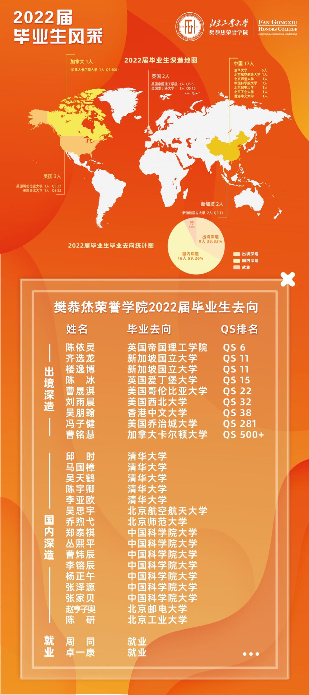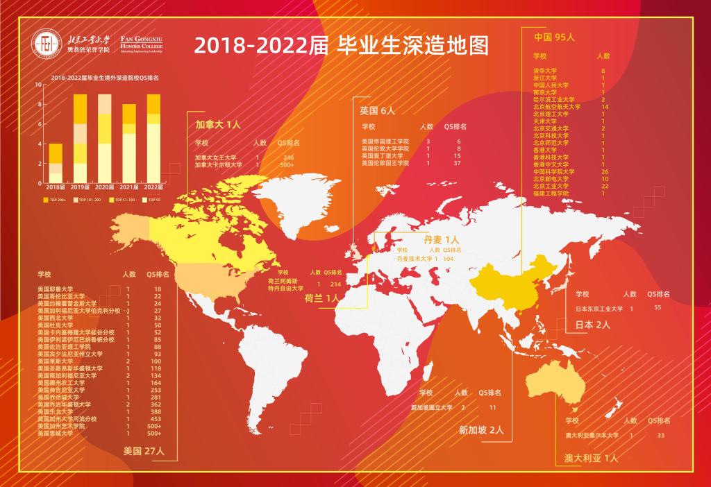 自2018年首届学生毕业以来,学院毕业生深造率不断提升,累计5届毕业生,共计142人,毕业率100%,总深造率90%以上。2022届共计毕业生27名,就业率100%,深造率92.6%,毕业生前往清华大学、中国科学院大学、北京航空航天大学等国内高水平院校深造16人,占59.3%,其中超过80%的国内深造的高校和科研单位学科评估等级为A以上;前往英国帝国理工学院、新加坡国立大学、美国哥伦比亚大学、香港中文大学等境外院校深造9人,占33.33%,境外深造的院校2023 QS排名前50的占比达到77.8%以上;2022届毕业生人才培养成果显著,深造情况达历史最好水平。