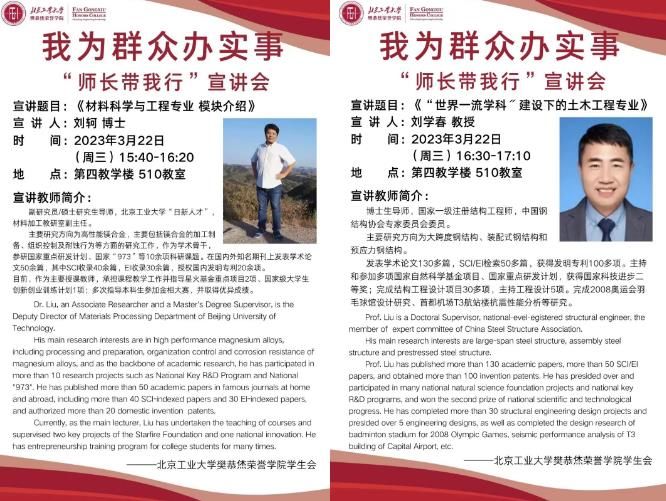 材制学部材料加工教研室副主任刘轲博士,城建学部国家一级注册结构工程师刘学春教授,为同学们介绍了材料类和土木类的专业学习内容,帮助同学们了解材料类和土木类学科的专业发展前景。本次活动由袁莉敏老师主持。