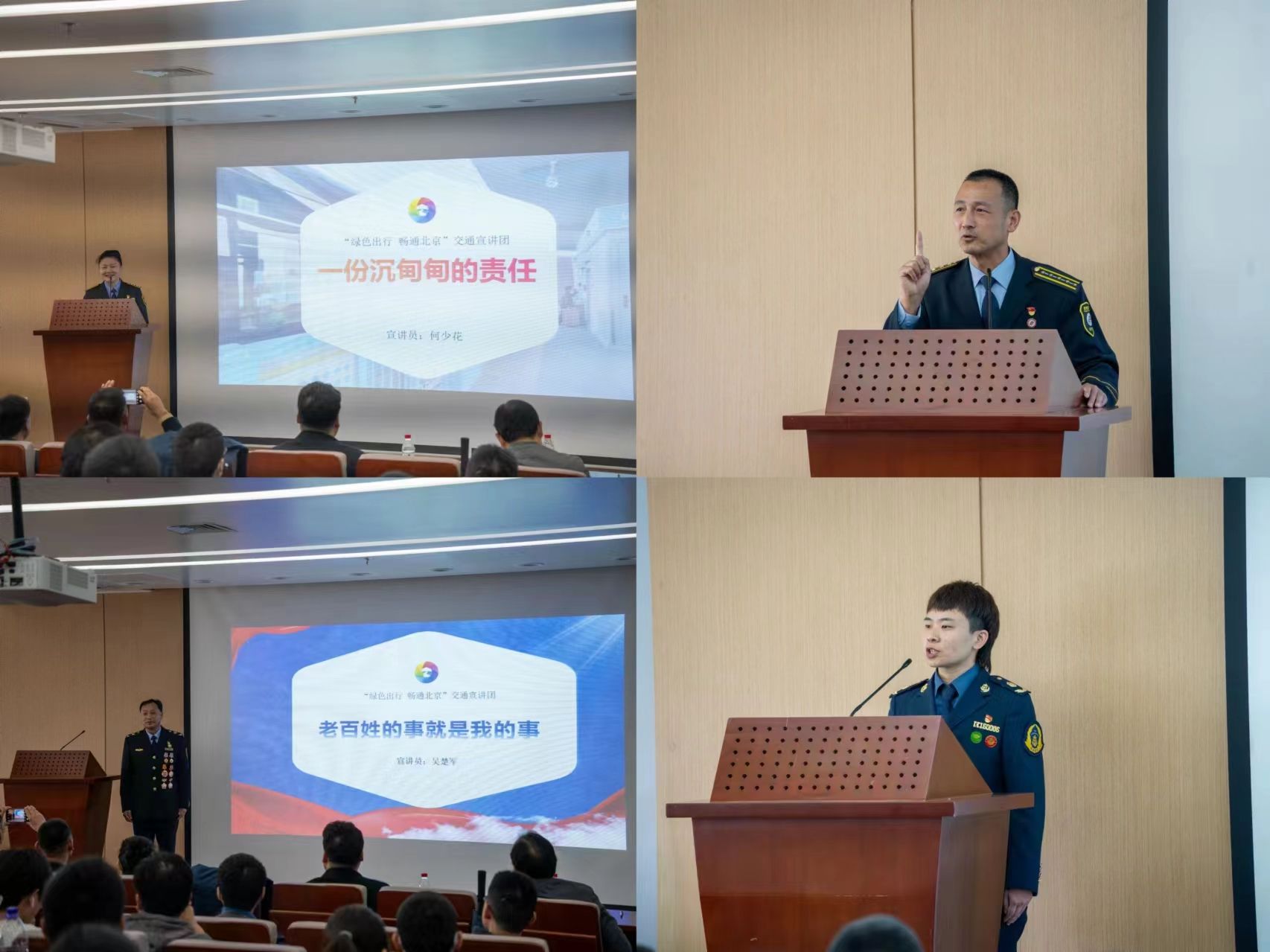 之后分享的是全国交通运输系统先进工作者、北京市交通运输综合执法总队一支队副支队长吴楚军。他在从一名军人向交通执法人员的转变中,始终秉持为民服务的宗旨,解决群众遇到的实际问题,如帮助被骗的老人追回损失,打击故宫周边的非法旅游行为等等。吴楚军的故事展现了他对执法职业的热爱和对社会公平正义的坚持,以及他在保障首都交通秩序和服务民众方面的突出贡献。