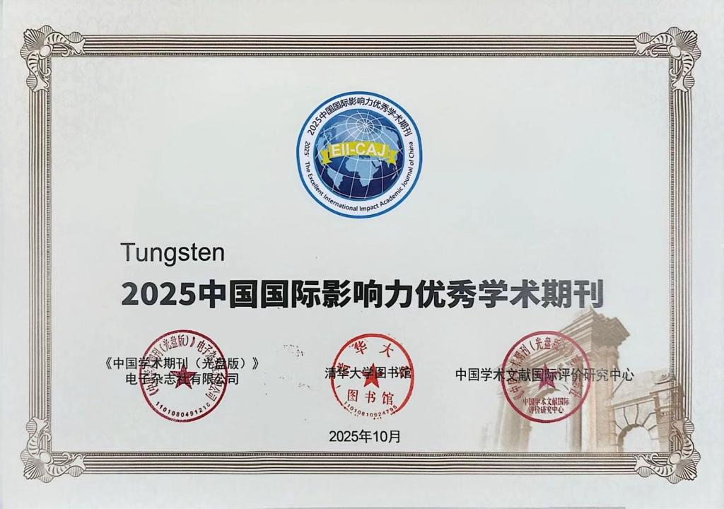 本网讯 近日,由中国知网和清华大学图书馆联合研制的《中国学术期刊国际引证年报》(2025版)正式发布。我校主办的《钨科技(英文)》(《Tungsten》)连续两年入选“2025中国国际影响力优秀学术期刊(自然科学与工程技术·英文)”榜单。在此次评选中,《钨科技(英文)》期刊核心指标——国际引证传播指数(ICCI)较去年取得较大进步,达63.477,在入选的150本同类别优秀期刊中位列第17位,较上一年度跃升95位。