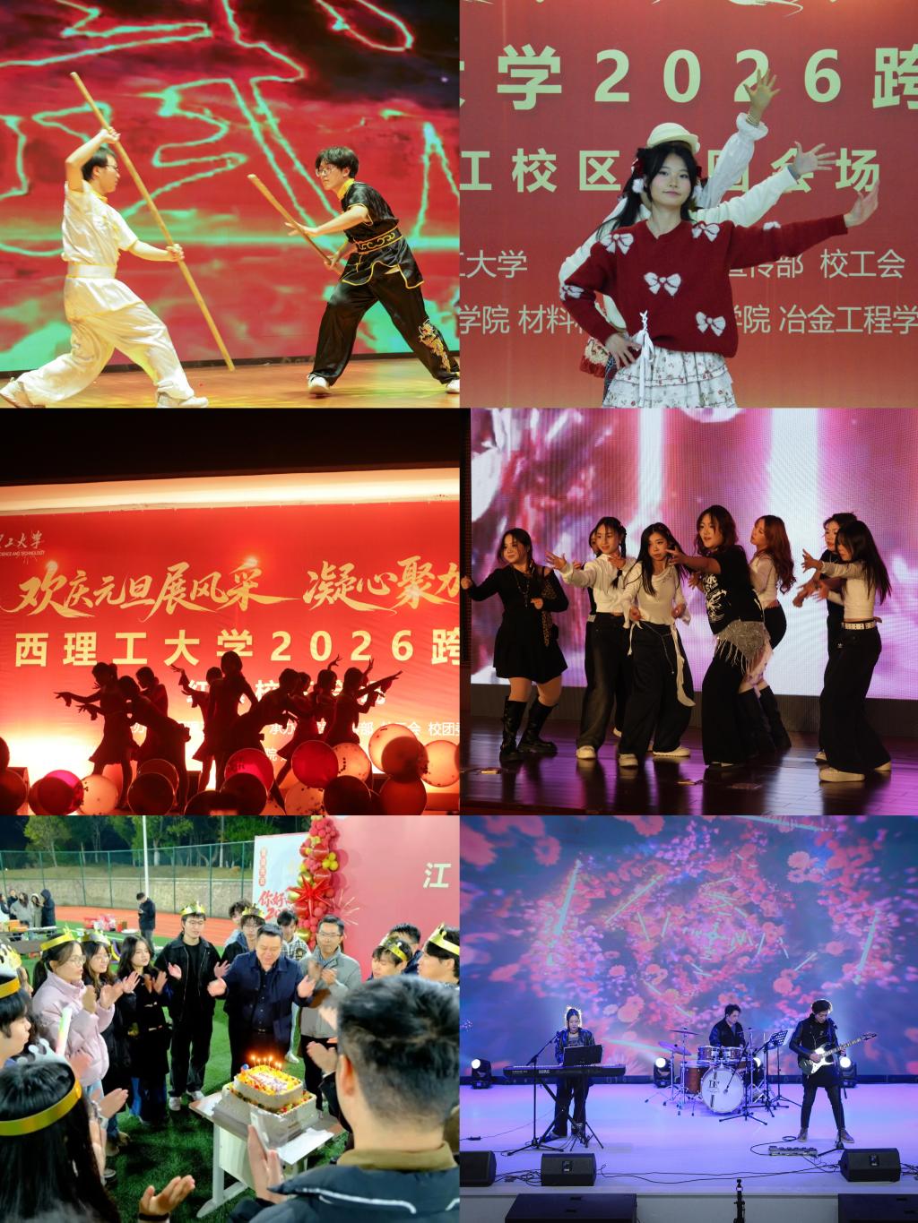 本网讯 岁序更替,华章日新。2025年12月30日晚至2026年1月1日上午,江西理工大学三江校区东园、西园,红旗校区,南昌校区,先进铜产业学院、电子信息产业学院各大校区及产业学院同步联动举办跨年晚会,并于元旦清晨举行升国旗仪式。江理师生以昂扬姿态告别过往、迎接新岁,凝聚起“志存高远、责任为先”的奋进力量。