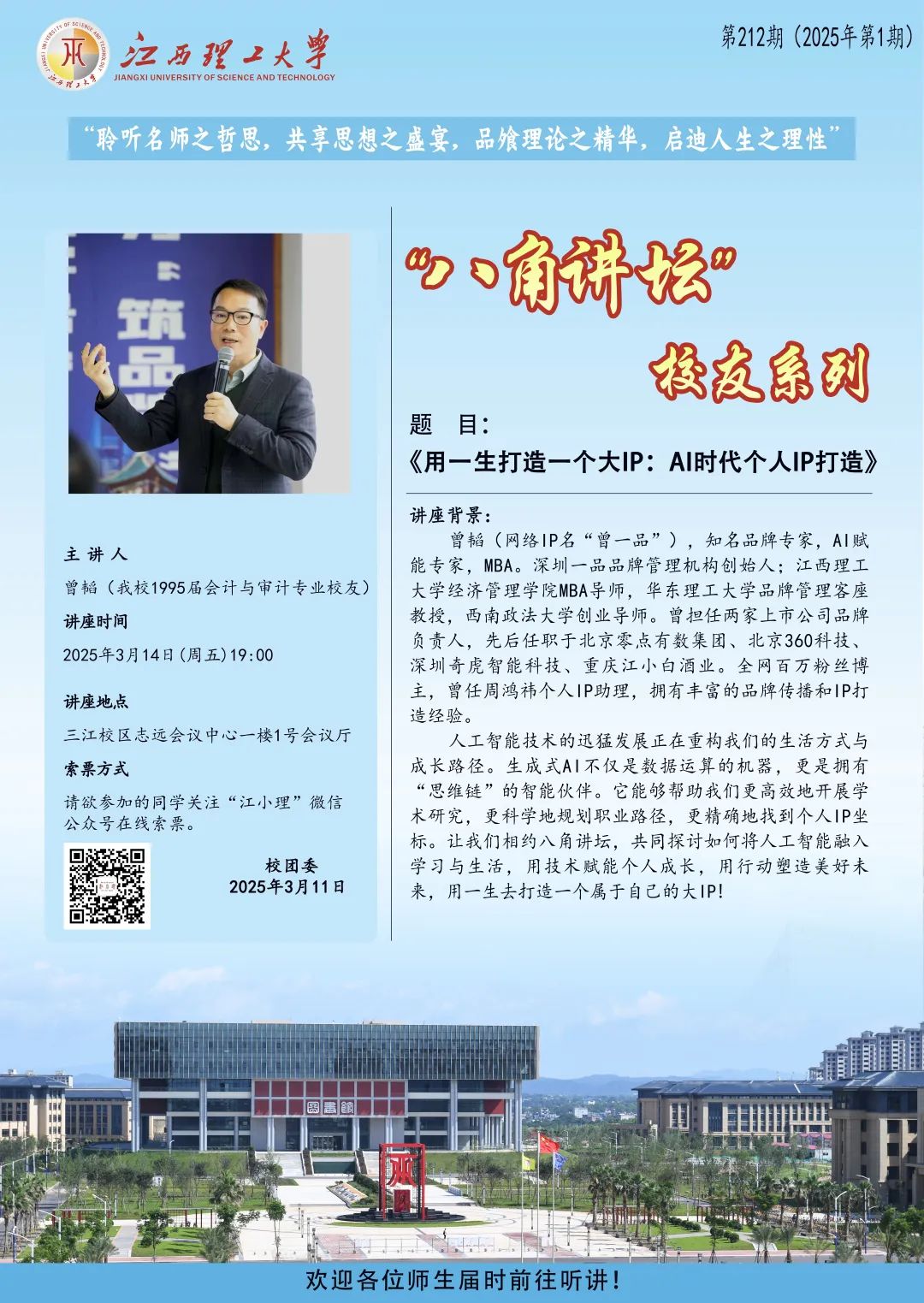人工智能技术的迅猛发展正在重构我们的生活方式与成长路径。生成式AI不仅是数据运算的机器,更是拥有“思维链”的智能伙伴。它能够帮助我们更高效地开展学术研究,更科学地规划职业路径,更精确地找到个人IP坐标。让我们相约八角讲坛,共同探讨如何将人工智能融入学习与生活,用技术赋能个人成长,用行动塑造美好未来,用一生去打造一个属于自己的大IP!