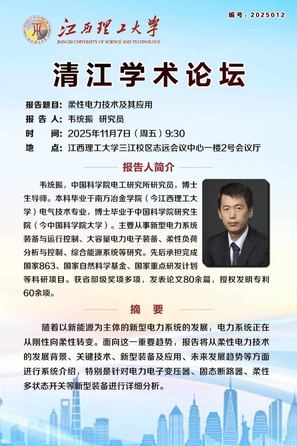 讲座背景:韦统振,中国科学院电工研究所研究员,博士生导师。本科毕业于南方冶金学院(今江西理工大学)电气技术专业,博士毕业于中国科学院研究生院(今中国科学院大学)。主要从事新型电力系统装备与运行控制、大容量电力电子装备、柔性负荷分析与控制、综合能源系统等研究。先后承担完成国家863、国家自然科学基金、国家重点研发计划等科研项目。获省部级奖项多项,发表论文80余篇,授权发明专利60余项。