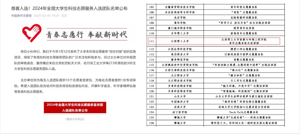 本网讯 2月5日,中国青年志愿者协会、中国科协宣传文化部公布了2024年全国大学生科技志愿服务宣讲团入选团队名单,我校资源与环境工程学院青年志愿者协会宣讲团成功入选。